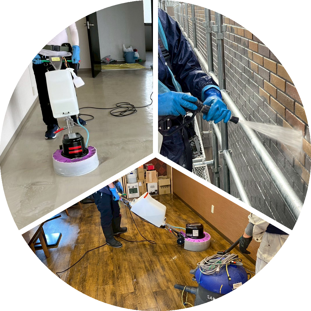賃貸物件入退去のルームクリーニング、オフィス・店舗・一般家屋の大規模清掃作業、マンションの共用部等の定期清掃・巡回清掃等、建物の規模・内容に最もマッチする、専門用具・技術を用いた専門的・分業的プランで、清潔な環境づくりをサポートいたします!